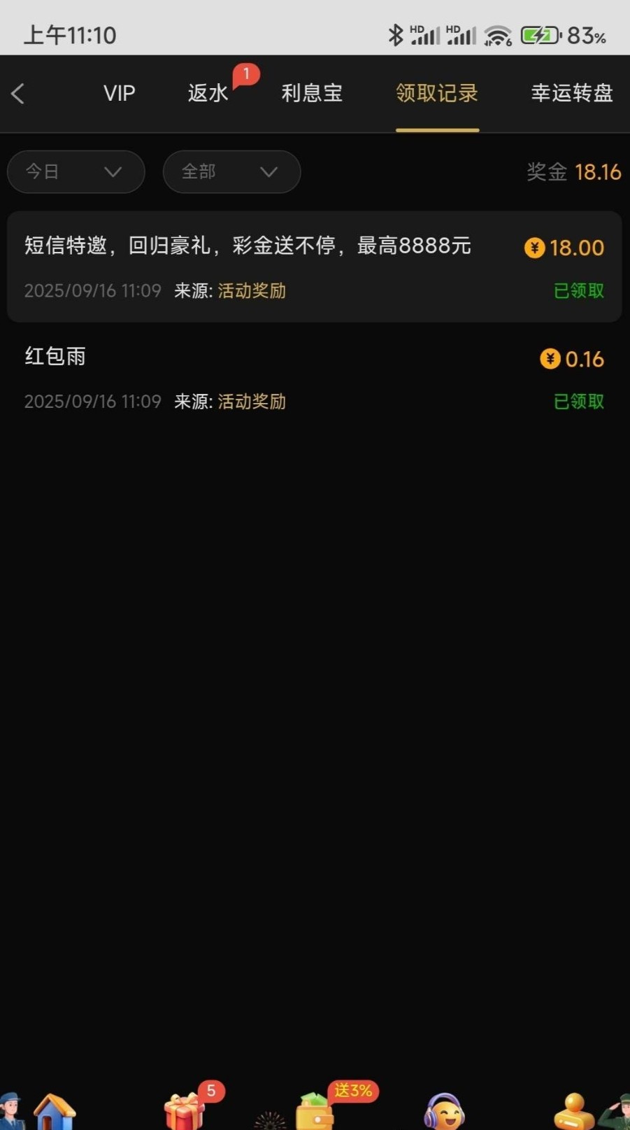 之前是特邀短信自助送9,现在又出了一个短信回归,之前领过9的估计这个也可以领。