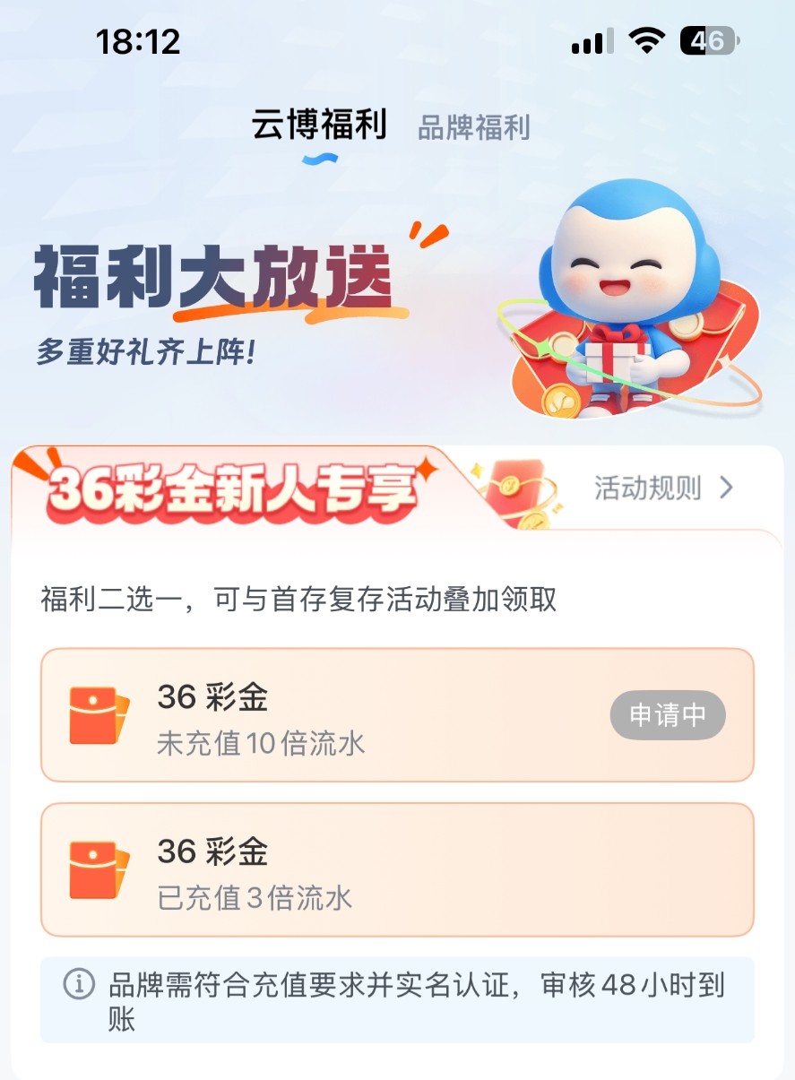 依旧博系,白嫖即可请勿充值,注册账号绑定信息即可申请36新人彩金,48小时审核时间,这个期间可以领取8+8的绑定手机号和银行卡的彩金,绑定好就可以直接领取。