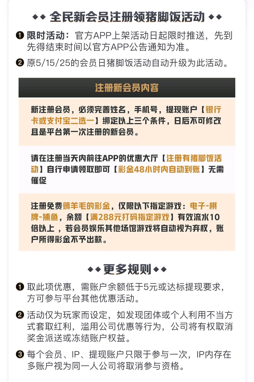 ✅注册后绑定手机号码还有提现信息,到首页的优惠大厅一键自助申请即可,彩金只能玩捕鱼,电子(五轴)满288彩金十倍流水即可全提