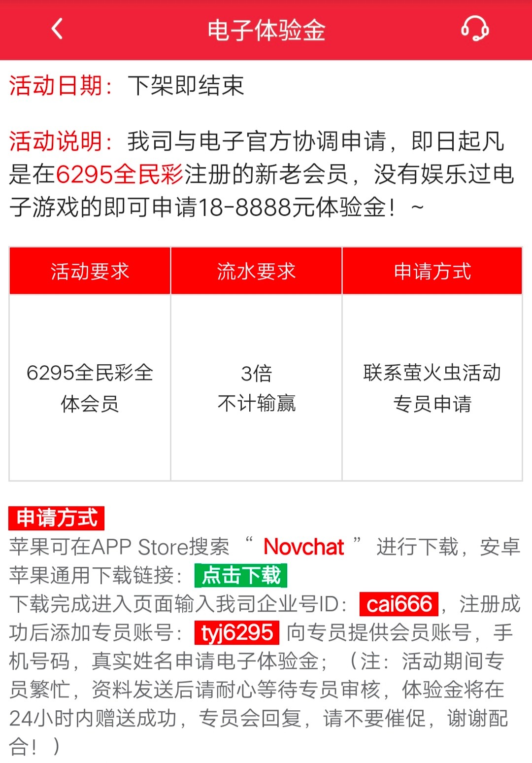 注册登录,下载萤火虫登录输入企业号ID: cai666 ,注册成功后添加专员账号: tyj6295 向专员提供会员账号,手机号码,真实姓名申请电子体验金,不送无视。